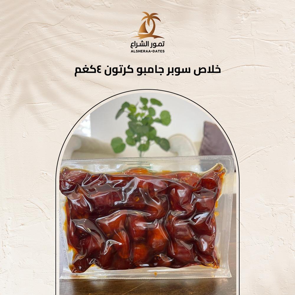 استمتع بمذاق التمر الطازج والفاخر مع خلاص سوبر جامبو التي تحتوي على 4 كغم مليئة بالتمر الطيب والمغذي حيث يتميز تمر الخلاص بنكهته الحلوة والقوام الطري الذي يذوب في فمك مما يجعله الخيار المثالي لتلبية احتياجاتك اليومية من الطاقة والفائدة. استمتع بأجود أنواع التمور الفاخرة مع متجر الشراع للتمور! 🌴